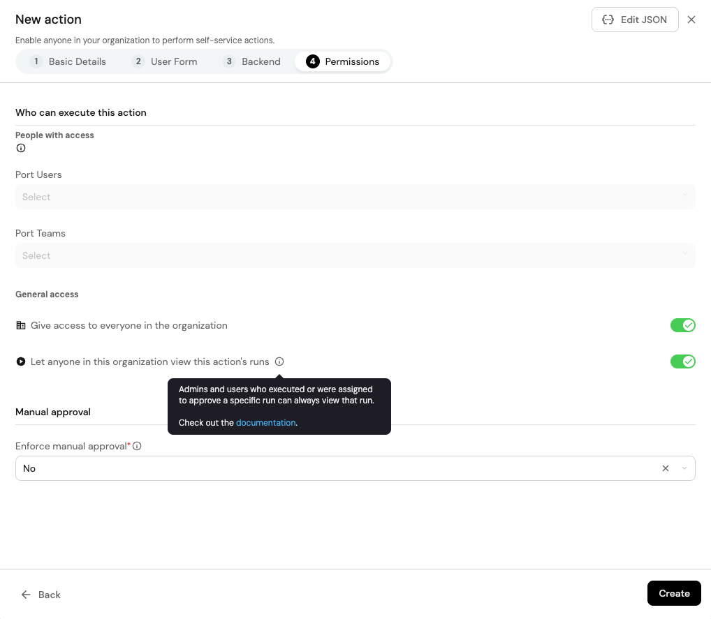 When creating or editing a self-service action, you can also control who can view its runs, using the relevant toggle in the Permissions tab.