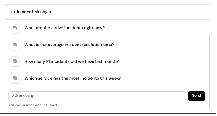 Context Awareness: The widget automatically understands the context of the page and entity where it's located. For example, when placed on a team entity page, you can ask questions like "What is this team's lead time for change?" or "How many open bugs does the team have?" without needing to specify the team name.