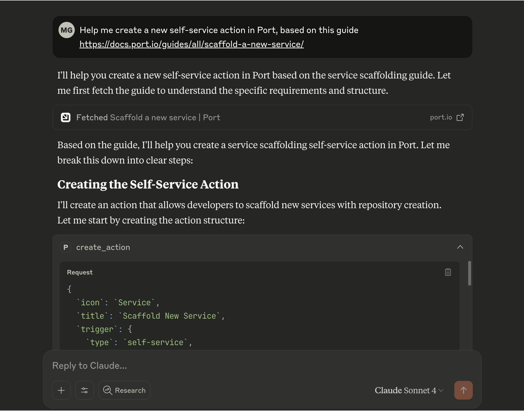 - Ask: "Create a new self-service action in Port to scaffold a new service"