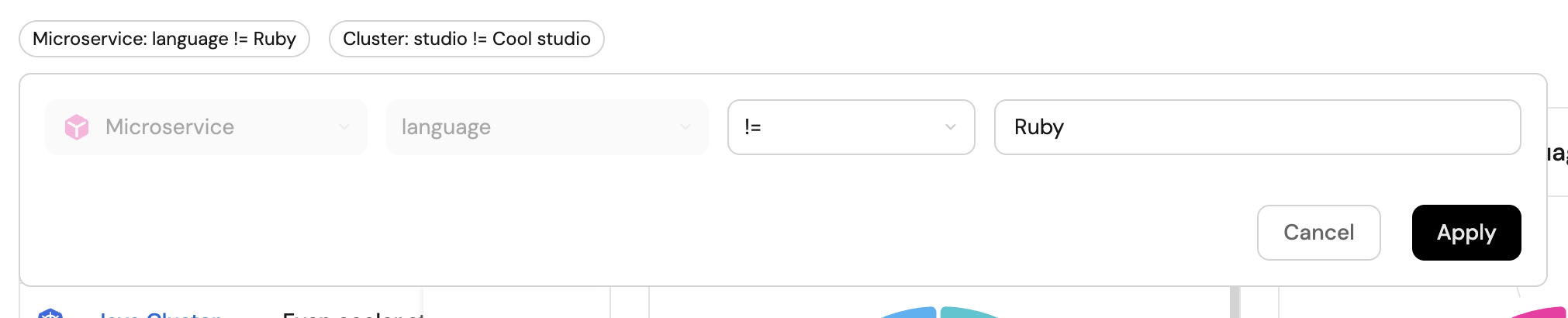 microserviceblueprint that excludes entities wherelanguage = Ruby. This filter only affects widgets that displaymicroservicedata. - A Basic properties filter on Owning teams, which applies to all supported widgets in the dashboard, regardless of blueprint.