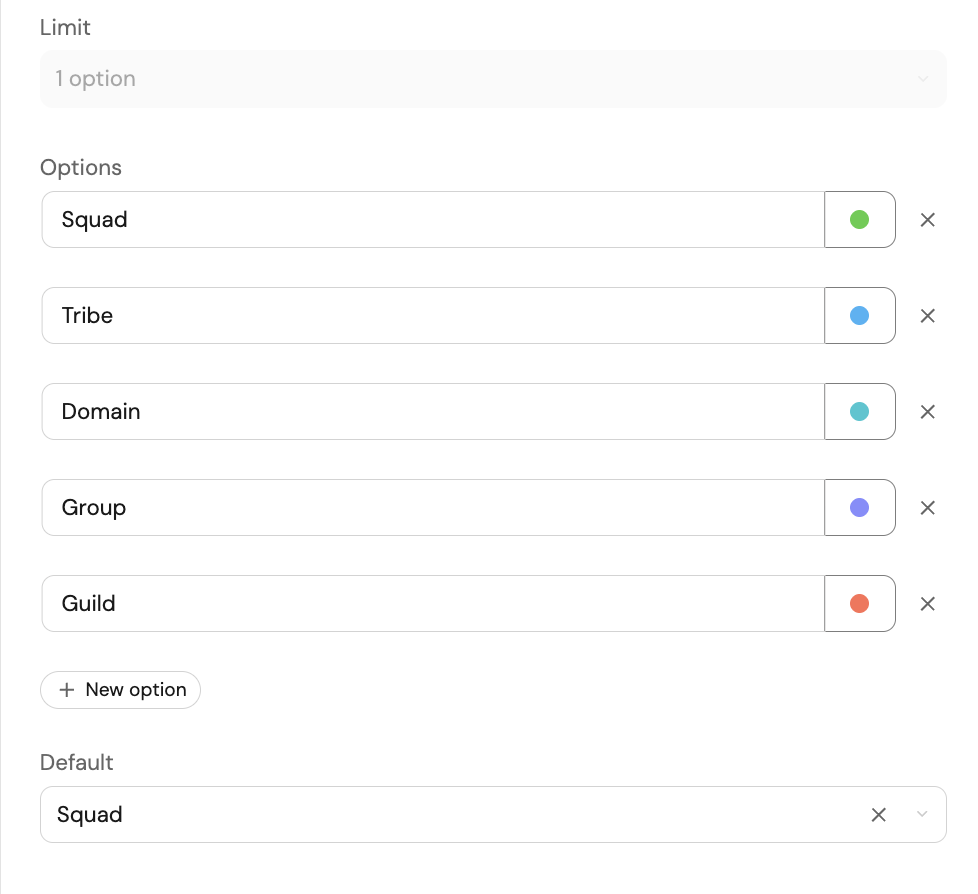 1. In the Team blueprint card, click on + New property, and choose Enum as the property type.