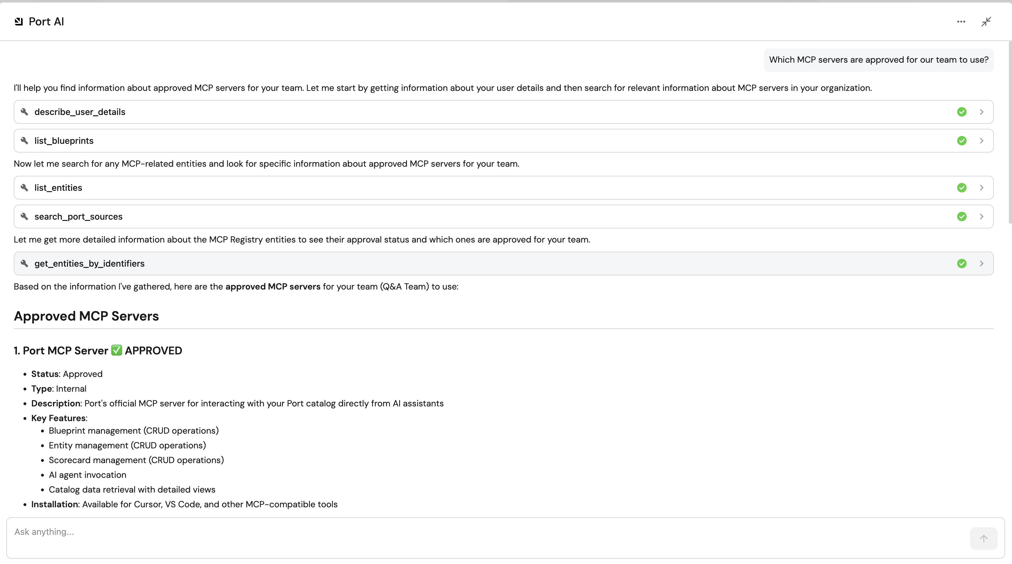 Leverage Port's AI capabilities to enable intelligent discovery and recommendations for MCP servers. With your MCP server registry in Port, you can use Port AI to answer questions like: